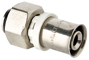 Прямий прес-фітинг для приєднання металополімерної труби до компонентів системи, які мають зовнішню різьбу (дюймова за ГОСТ 6357) за допомогою накидної гайки. Ущільненням різьбового з'єднання служить штатна прокладка. Додаткових герметиків не потрібно. |